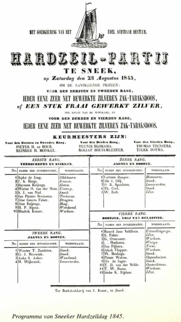 We gaan teruch in de tiëd, en make wat sprongen deur de jaren, fan 17 augustus 1859 naar 8 maart 1767 etc, maar allemaal de dachen dat de Sneker hardsyldach houden wurdde. Fan allerhande skepen deden hieraan met, fracht en beurtskepen, jachten en boeiers, snikken en vis aken. Disse ferskillende boaten waren in klassen ferdeeld en in elke klasse was dur un prys tu winnen, en un premie. Un silferen suurstel was de prys in de earste klasse en de premie was un pendule. Enkele andere foarbeelden fan prysen dy tu winnen waren in 1859, binne bijfoarbeeld: silferen tafelstellen, silferen blaker, silferen súkerskalen, asbakken, inktstellen, tabaksdoasen etc. Alle prysen waren fan silfer, in dy tiëd nyt su freemd want ut beroep fan silfersmid kwam un soat foar, ok in Sneek. At skippers met doën wúden aan de sylerij kon,n su sich de dach fan tu foaren aanmelde tot hardsyldach self foar ’s morgens 9 uur. Om kwart foar tien was dan de loating met derna de keuring en meting fan de skepen.