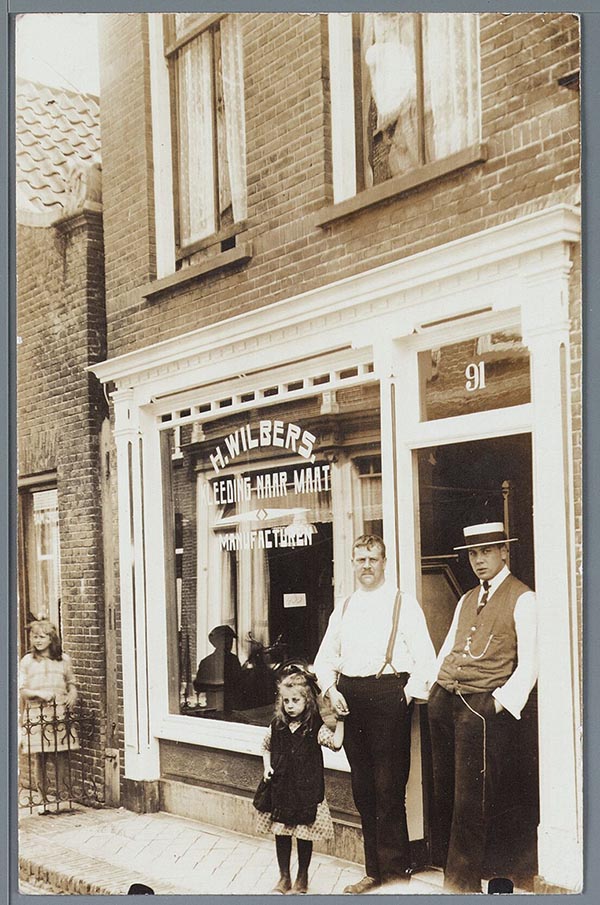 We siene Betty Wilbers an de hand fan fader Hendrik Wilbers. Rechts Sietze Wilbers, foor de winkel.
