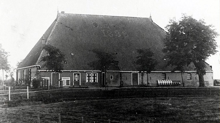 Toen de bouw bijna klaar was, ging disse boerderij in flammen op. Der is geen foto fan, maar dus wel een tekening.