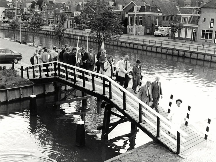 In 1990 mocht Bokke Bok het nieuwe brugje officieel in gebrúk nimme. Helaas hew ik niet een foto fan hem. Op foto 3, die ik wel had, ken je sien dat er ter gelegenheid fan de feestelijke inwijding een heel gefolg over de brug liep.