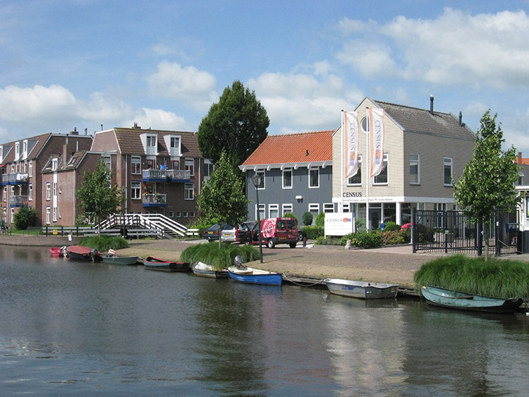 Links achter het brugje huuskes van de Badhuisbuurt en dêr foor het pakhuus fan klompehandelaar Harmen Zeylemaker.