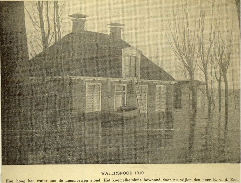Iemand die de Lemmerweg útloapen was sag an beide kanten niks anders dan water. Het leek wel of de weg deur een groat meer liep. De boerderijen an weerskanten waren alleen nog met roeiboatsjes te bereiken en in een fan die woaningen stond het water wel een halve meter hoog.