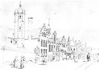Het oorspronkelijke gebouw bestond uit twee bouwlagen en had een L-vormige plattegrond. In de oksel van de twee vleugels stond een traptoren met een uivormige bekroning. Die toren stond op een voorplein dat aan de Marktstraat lag. Deze situatie is te zien op de pentekening rechtsboven, in 1747 vervaardigd door Cornelis Pronk.